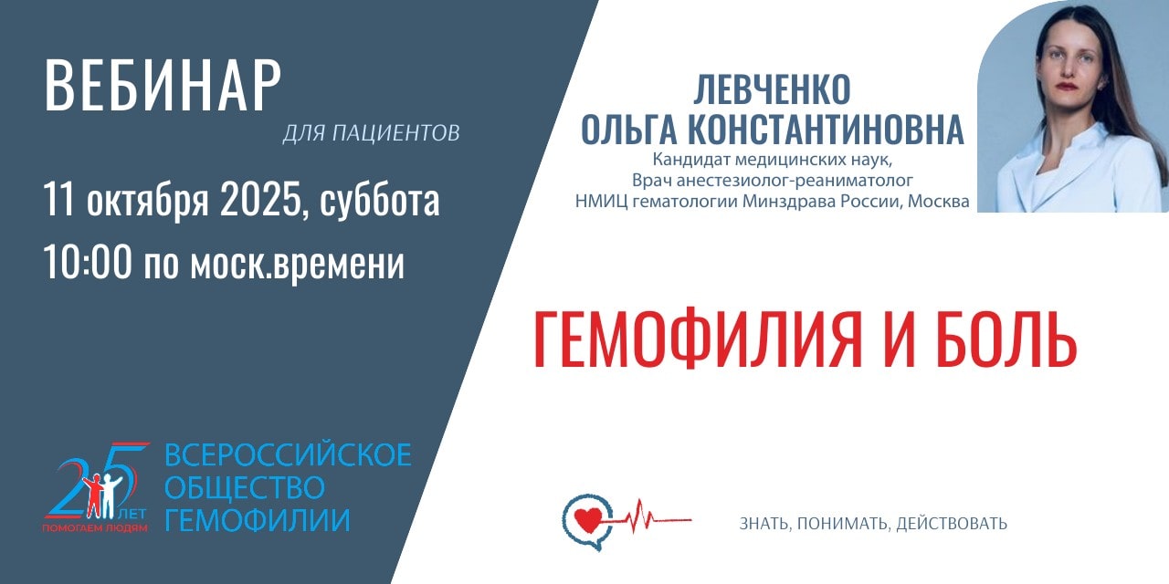 В субботу 11 октября 2025 г. состоится вебинар на тему "Гемофилия и боль". Наш гость - Левченко Ольга Константиновна, кандидат медицинских наук, врач анестезиолог-реаниматолог, заведующий методическим симуляционно-аккредитационным центром ФГБУ «НМИЦ гематологии» Минздрава России, а также заведующий редакцией журнала «Гематология и трансфузиология»