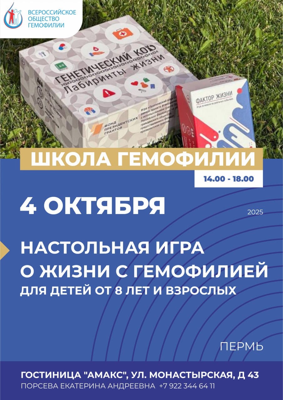 Информационный семинар "Школа гемофилии" состоится в субботу 4 октября 2025 года г. Пермь, ул. Монастырская, 43, гостиница «Амакс», 1 этаж, конференц-зал. Начало семинара в 14 часов.