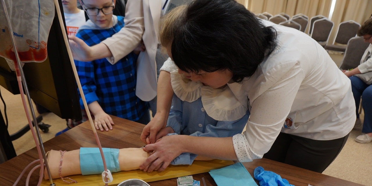 Юные пациенты отрабатывали практические навыки внутривенных инъекций на манекене под чутким руководством медицинской сестры Сериковой Юлии Викторовны.