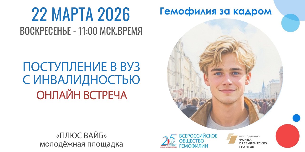 22 марта 2026 в рамках проекта «Гемофилия за кадром» состоялась онлайн-встреча, посвящённая вопросам поступления в вуз абитуриентов с инвалидностью
