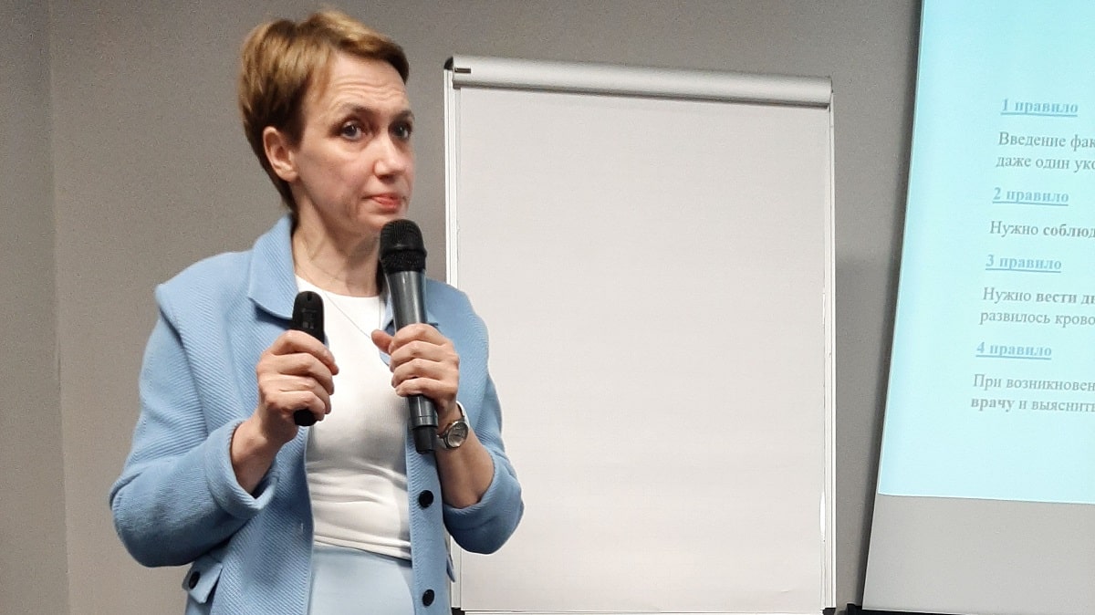 Завершилось мероприятие мастер-классом по внутривенному введению, которое провела с гостями и участниками занятия медсестра высшей квалификационной категории Городского гематологического центра ГБУЗ НСО ГКБ № 2 – Юлия Владимировна Бондарева. Она подробно объяснила и показала, каким образом ставятся внутривенные инъекции. Все желающие смогли потренироваться на тренажере.